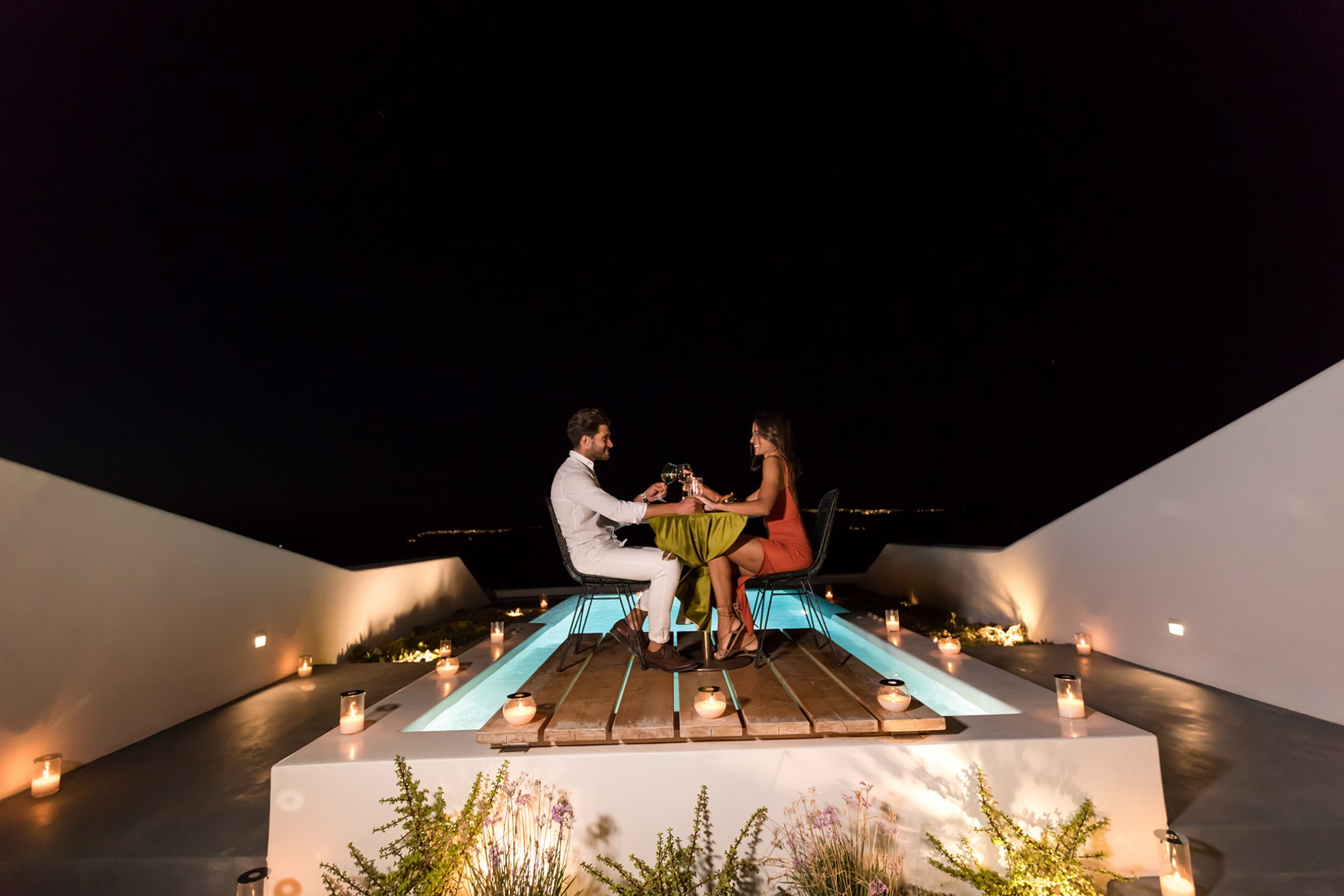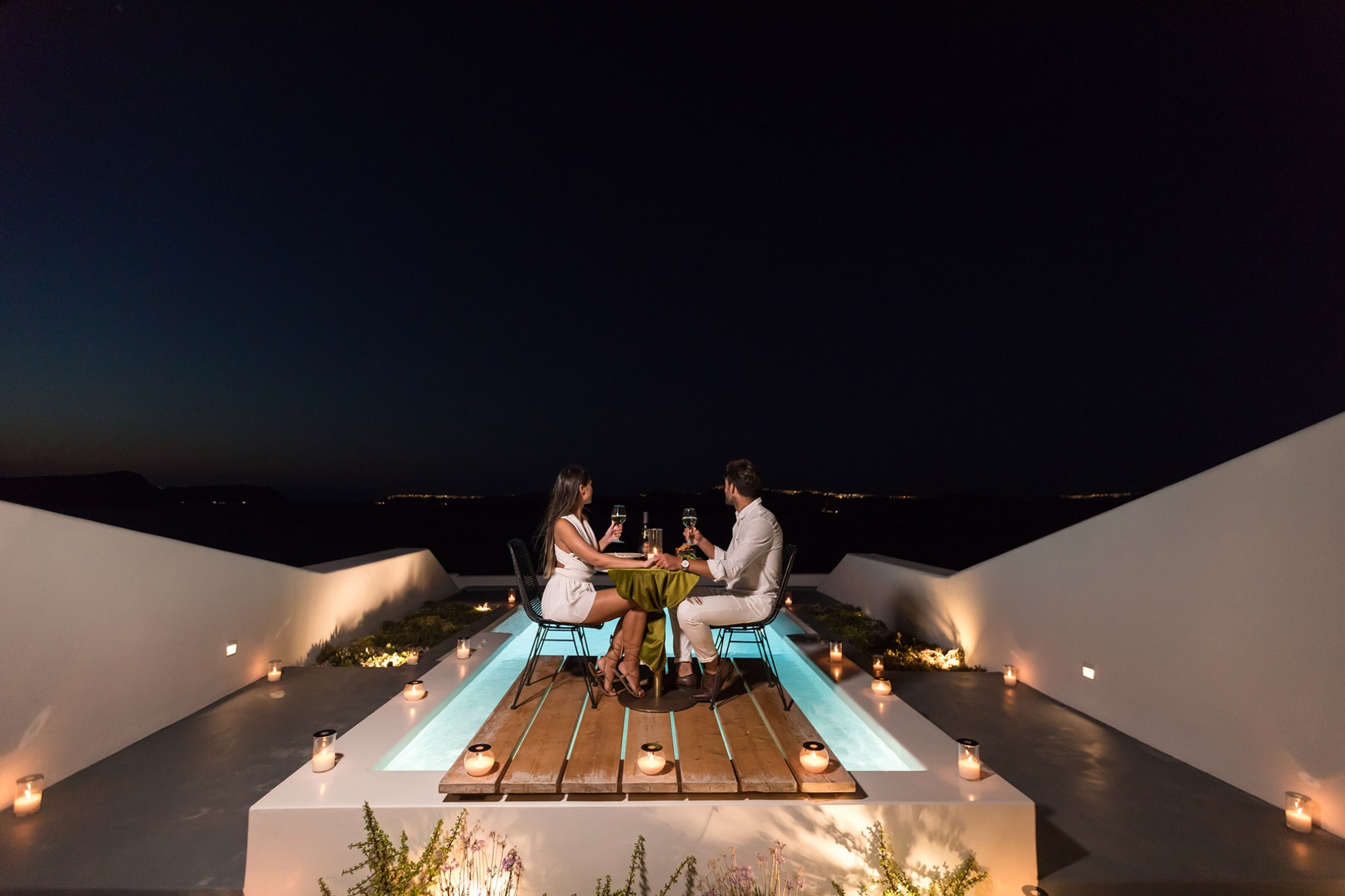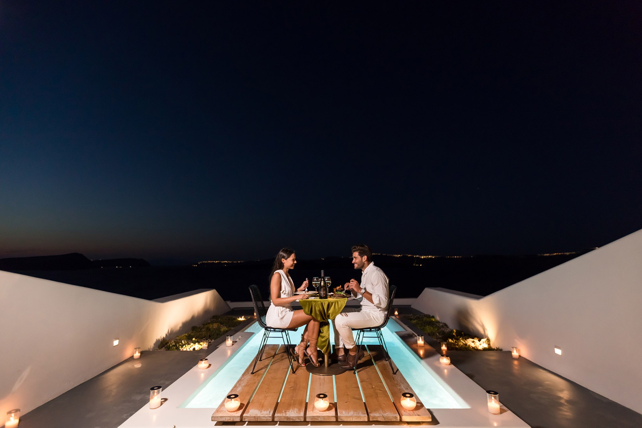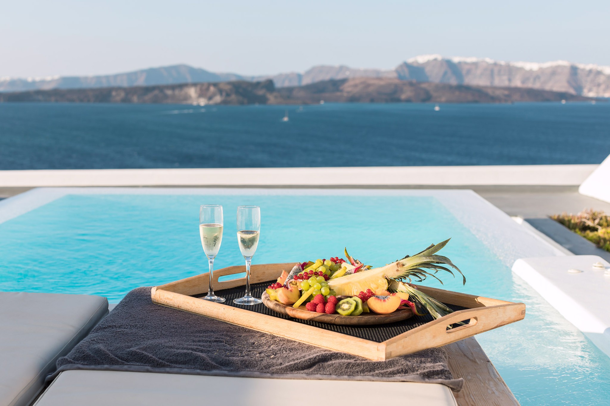 On top of that, you will be served in a mesmerizing setting, on the private terrace of your suite or villa by the pool, where you will gaze at a breathtaking vista of the volcano and the caldera – a view to match the fervid gastronomic creations of our chef. Bon Appétit!