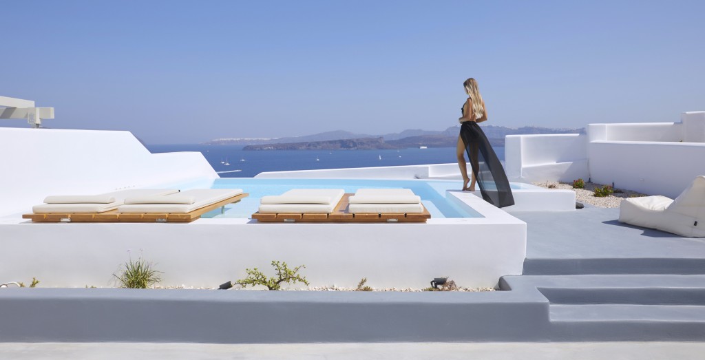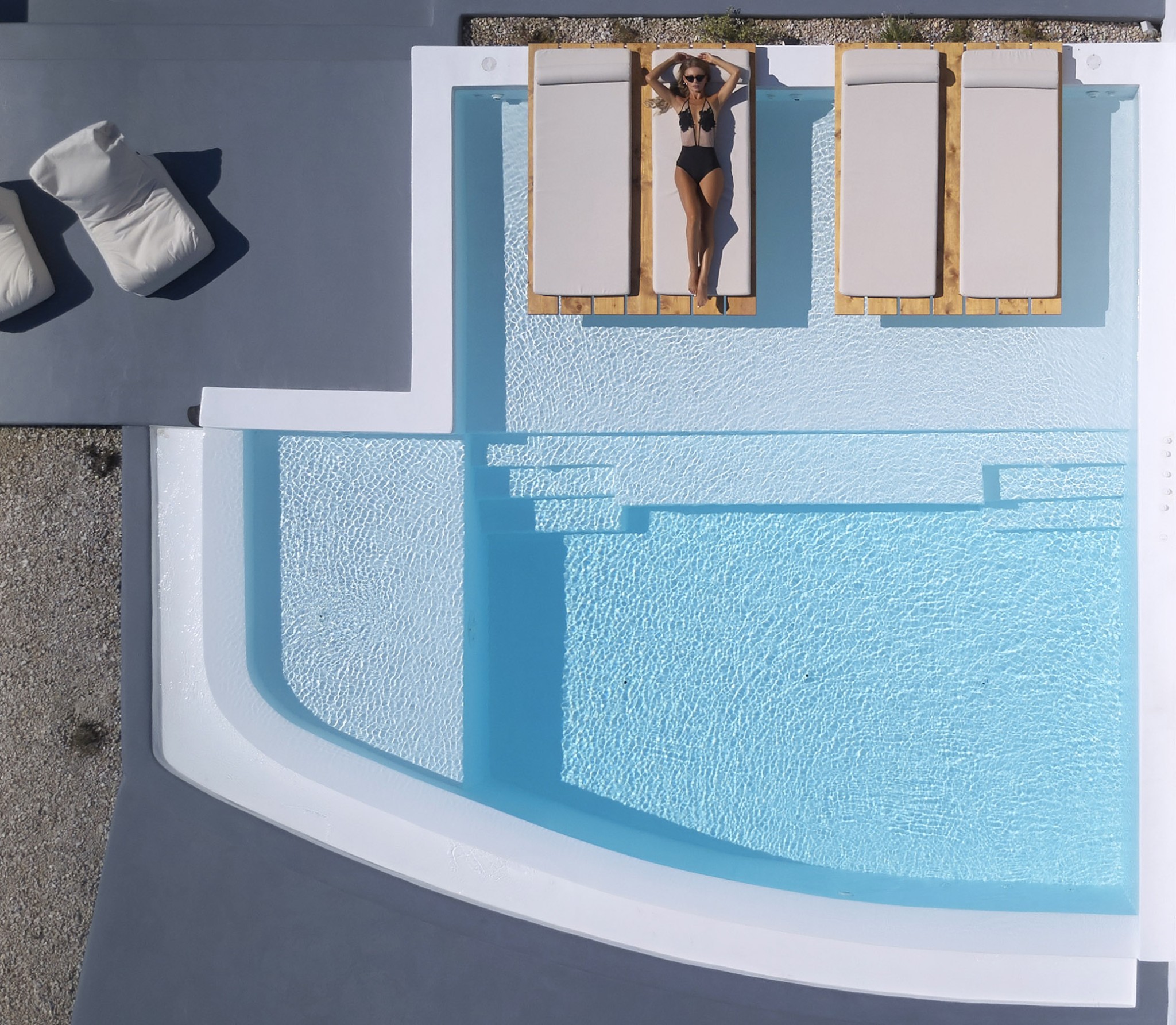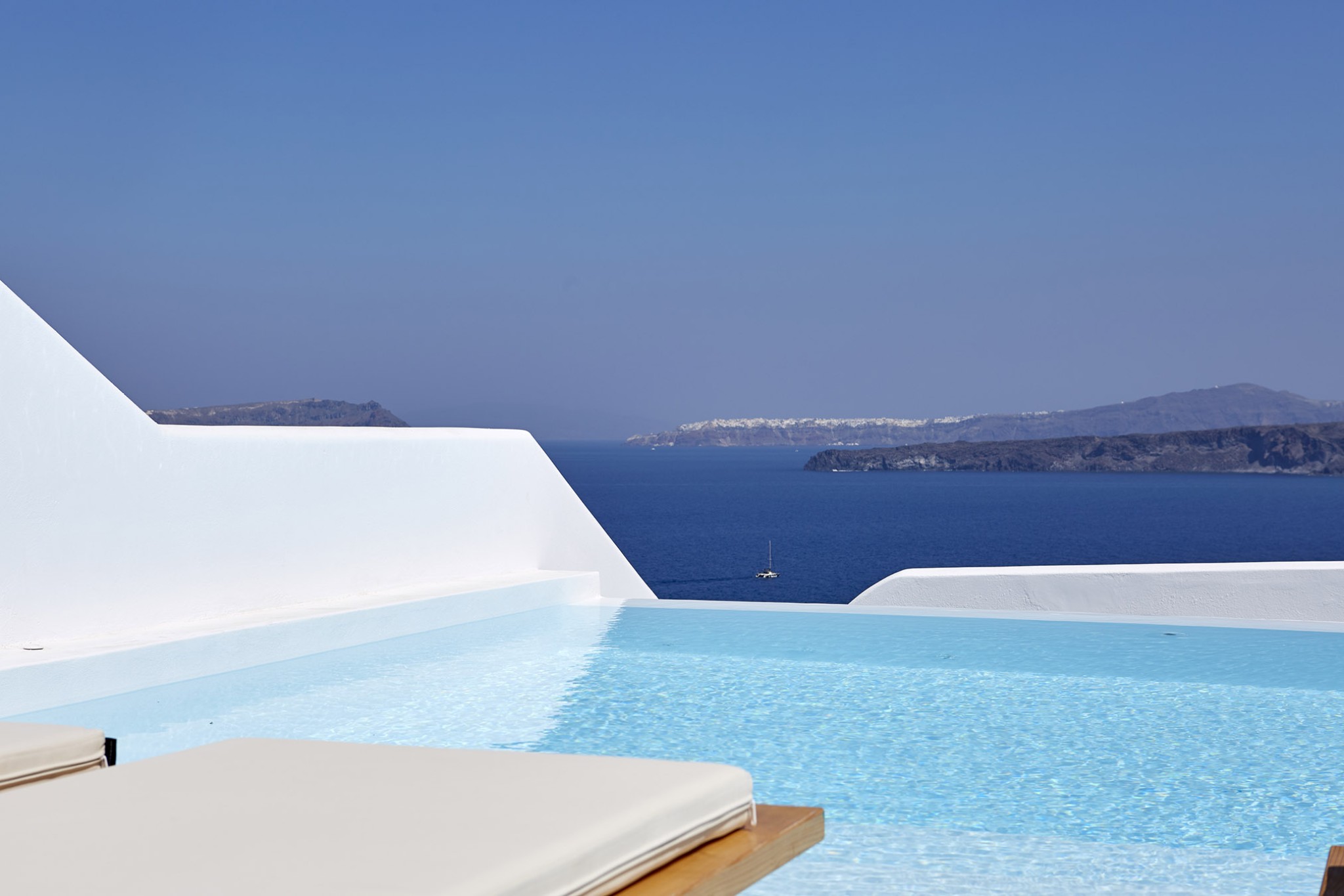 Stylish surroundings meet unpretentious luxury in the minimally adorned spacious villa. Plush amenities meet traditional curvy lines. Its spacious interiors make the perfect haven for couples and families. Two king-sized beds, two sleek bathrooms, an ample sitting area and elegant furnishings create a peaceful ambiance to indulge in its capacious interior. Just step out to the fully appointed private terrace to take in the superb vistas to the breathtaking Caldera. The sundeck overhung the water in a profoundly relaxing experience for all of its guests. The private heated infinity pool with hydromassage jets seems to float on the eternally charming Aegean Sea.